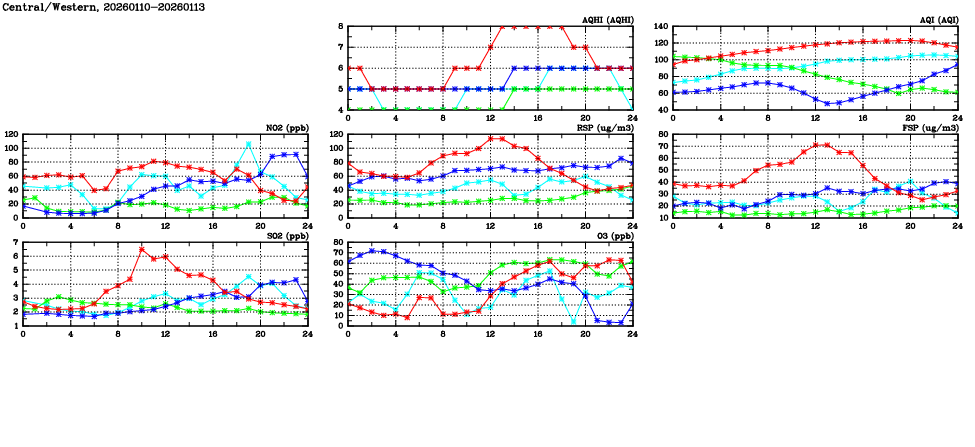 | Air Quality Data Time Series in Central/Western (2026/01/13) | ( Line colors: Day -3 Day -2 Day -1 Current day ) | 2D Map Current AQHI |