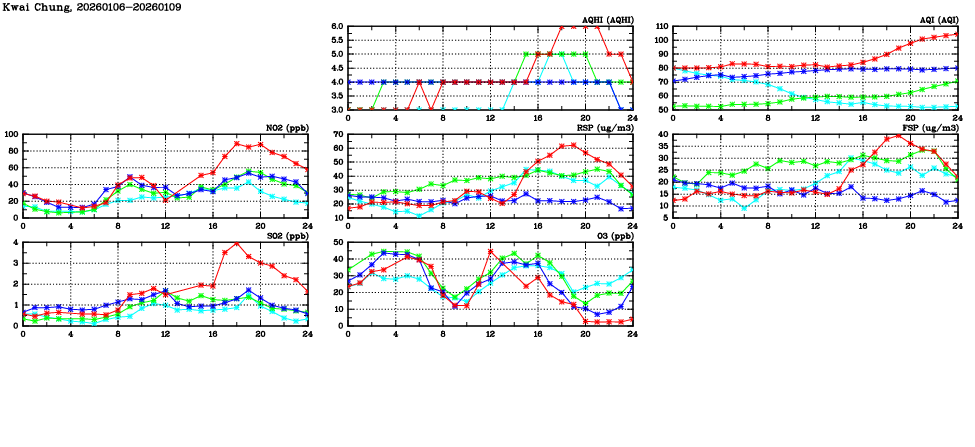 | Air Quality Data Time Series in Kwai Chung (2026/01/09) | ( Line colors: Day -3 Day -2 Day -1 Current day ) | 2D Map Current AQHI |
