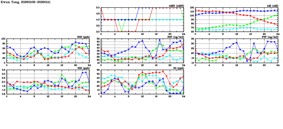| Air Quality Data Time Series in Kwun Tong (2026/01/11) | ( Line colors: Day -3 Day -2 Day -1 Current day ) | 2D Map Current AQHI |