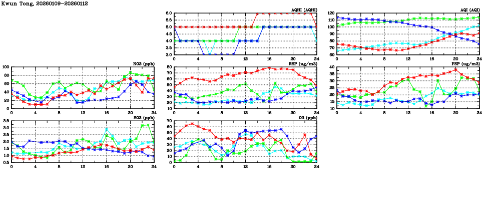 | Air Quality Data Time Series in Kwun Tong (2026/01/12) | ( Line colors: Day -3 Day -2 Day -1 Current day ) | 2D Map Current AQHI |