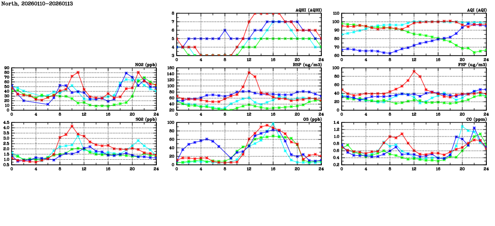 | Air Quality Data Time Series in North (2026/01/13) | ( Line colors: Day -3 Day -2 Day -1 Current day ) | 2D Map Current AQHI |