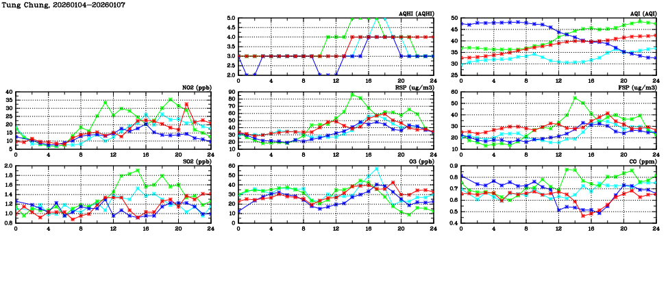 | Air Quality Data Time Series in Tung Chung (2026/01/07) | ( Line colors: Day -3 Day -2 Day -1 Current day ) | 2D Map Current AQHI |