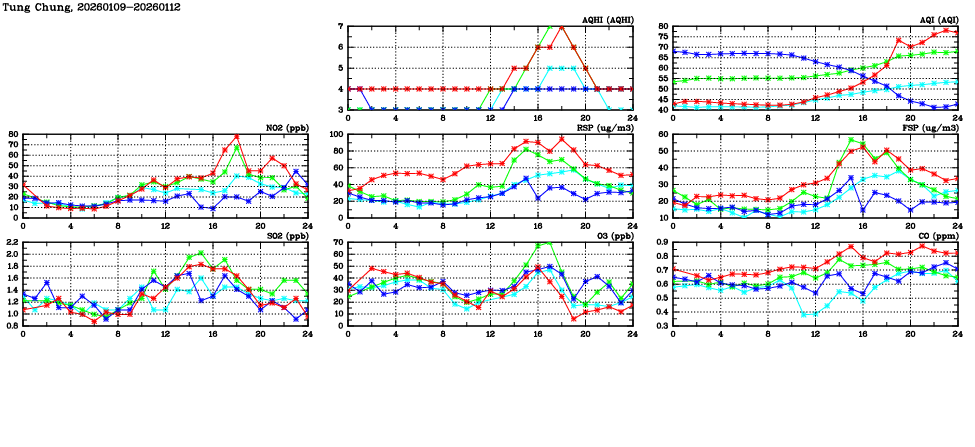 | Air Quality Data Time Series in Tung Chung (2026/01/12) | ( Line colors: Day -3 Day -2 Day -1 Current day ) | 2D Map Current AQHI |