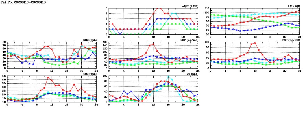 | Air Quality Data Time Series in Tai Po (2026/01/13) | ( Line colors: Day -3 Day -2 Day -1 Current day ) | 2D Map Current AQHI |