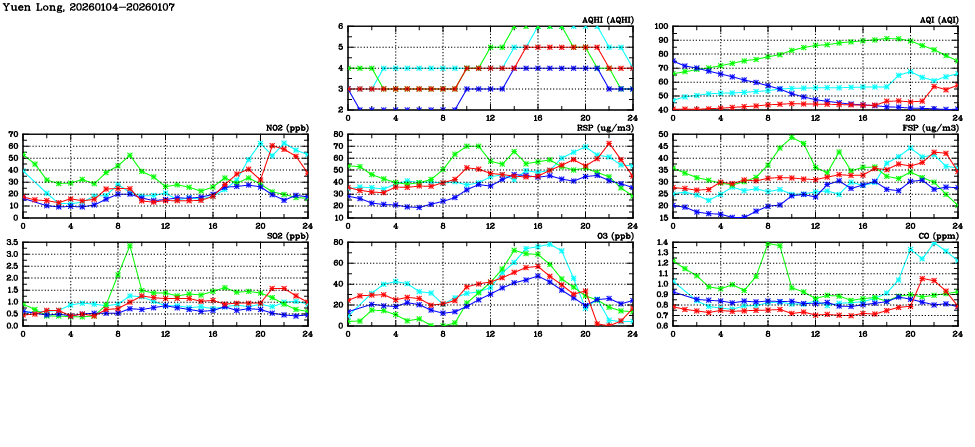 | Air Quality Data Time Series in Yuen Long (2026/01/07) | ( Line colors: Day -3 Day -2 Day -1 Current day ) | 2D Map Current AQHI |