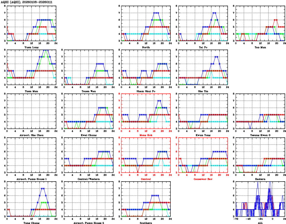 | Air Quality Data Time Series for AQHI (2026/01/11) | ( Line colors: Day -3 Day -2 Day -1 Current day ) | 2D Map Current AQHI |