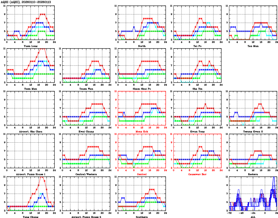 | Air Quality Data Time Series for AQHI (2026/01/13) | ( Line colors: Day -3 Day -2 Day -1 Current day ) | 2D Map Current AQHI |