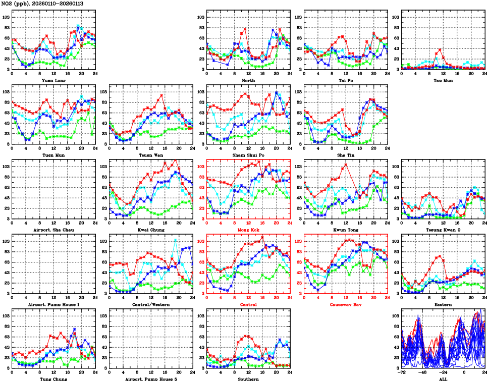 | Air Quality Data Time Series for NO2 (2026/01/13) | ( Line colors: Day -3 Day -2 Day -1 Current day ) | 2D Map Current AQHI |