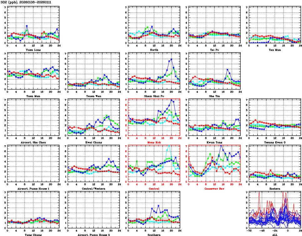 | Air Quality Data Time Series for SO2 (2026/01/11) | ( Line colors: Day -3 Day -2 Day -1 Current day ) | 2D Map Current AQHI |