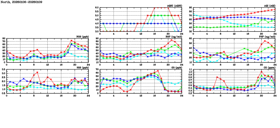 | Air Quality Data Time Series in North (2026/01/09) | ( Line colors: Day -3 Day -2 Day -1 Current day ) | 2D Map Current AQHI |
