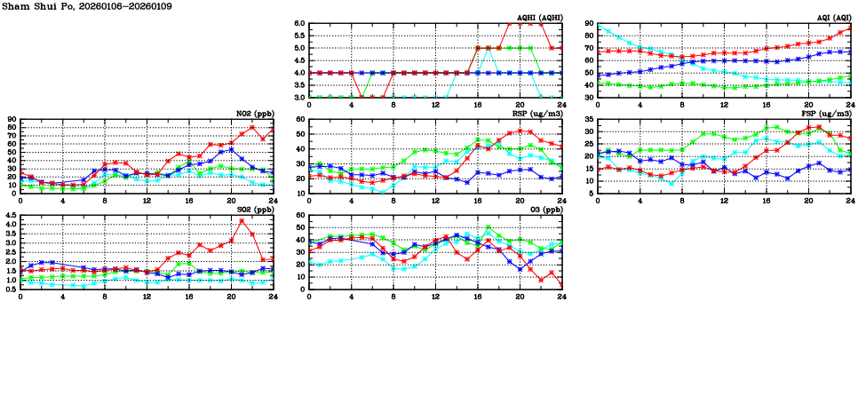 | Air Quality Data Time Series in Sham Shui Po (2026/01/09) | ( Line colors: Day -3 Day -2 Day -1 Current day ) | 2D Map Current AQHI |
