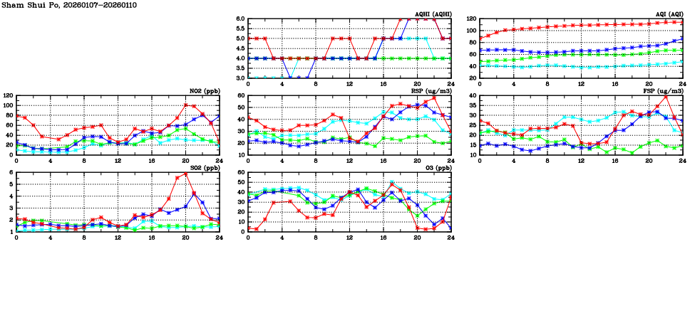 | Air Quality Data Time Series in Sham Shui Po (2026/01/10) | ( Line colors: Day -3 Day -2 Day -1 Current day ) | 2D Map Current AQHI |