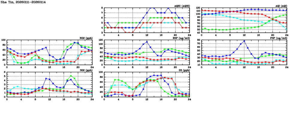 | Air Quality Data Time Series in Sha Tin (2026/01/14) | ( Line colors: Day -3 Day -2 Day -1 Current day ) | 2D Map Current AQHI |