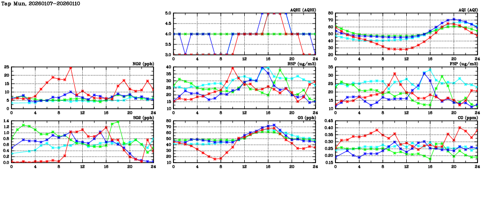 | Air Quality Data Time Series in Tap Mun (2026/01/10) | ( Line colors: Day -3 Day -2 Day -1 Current day ) | 2D Map Current AQHI |
