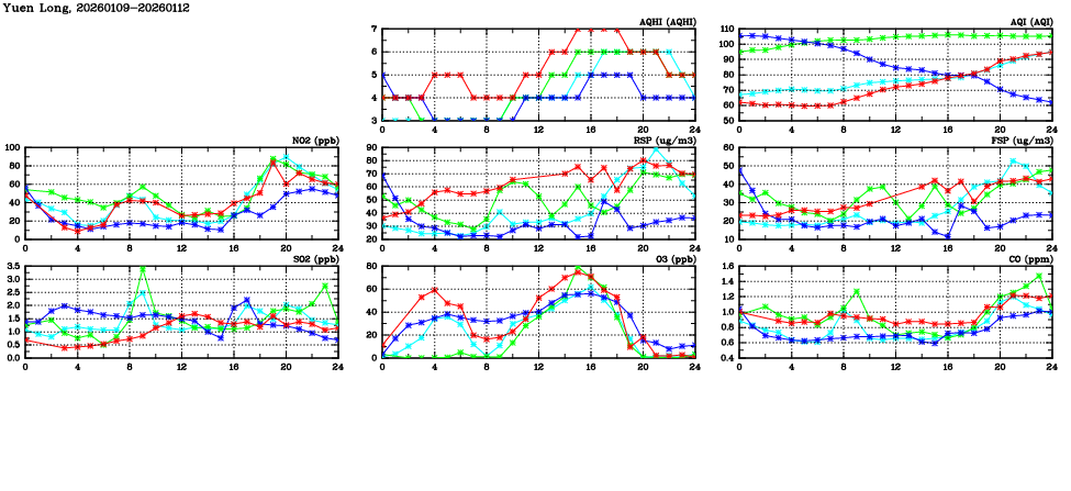 | Air Quality Data Time Series in Yuen Long (2026/01/12) | ( Line colors: Day -3 Day -2 Day -1 Current day ) | 2D Map Current AQHI |
