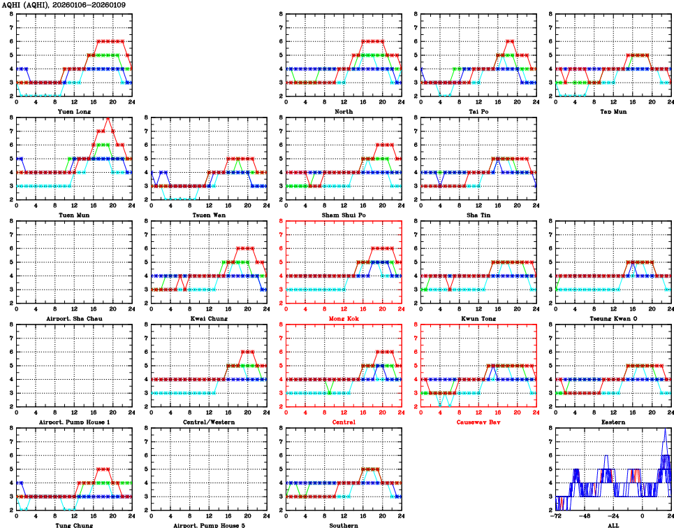 | Air Quality Data Time Series for AQHI (2026/01/09) | ( Line colors: Day -3 Day -2 Day -1 Current day ) | 2D Map Current AQHI |