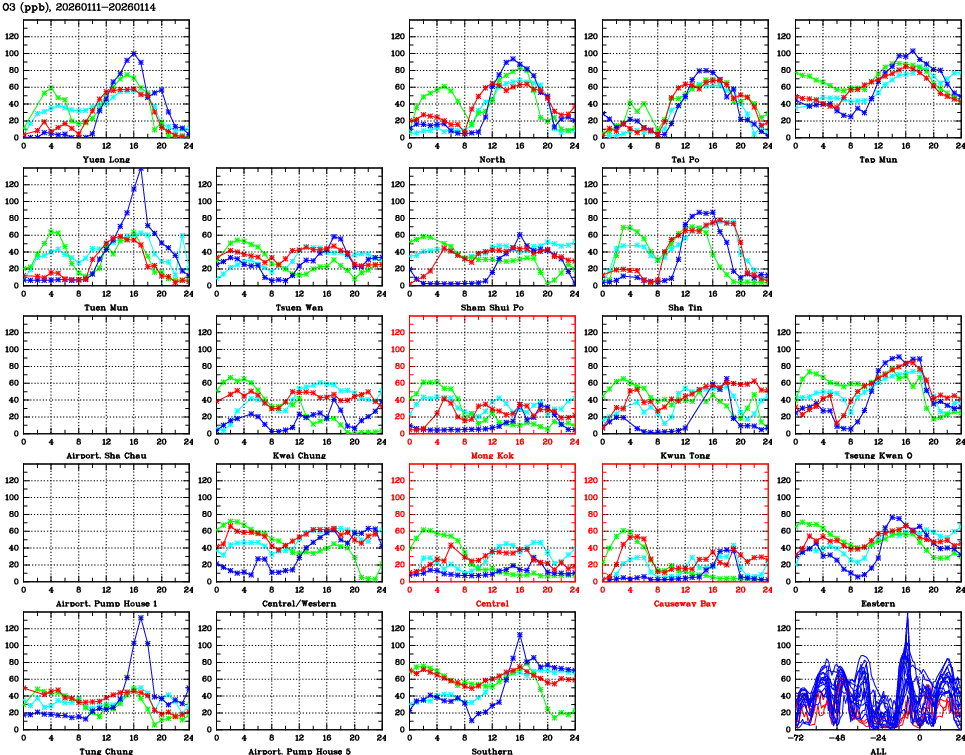 | Air Quality Data Time Series for O3 (2026/01/14) | ( Line colors: Day -3 Day -2 Day -1 Current day ) | 2D Map Current AQHI |