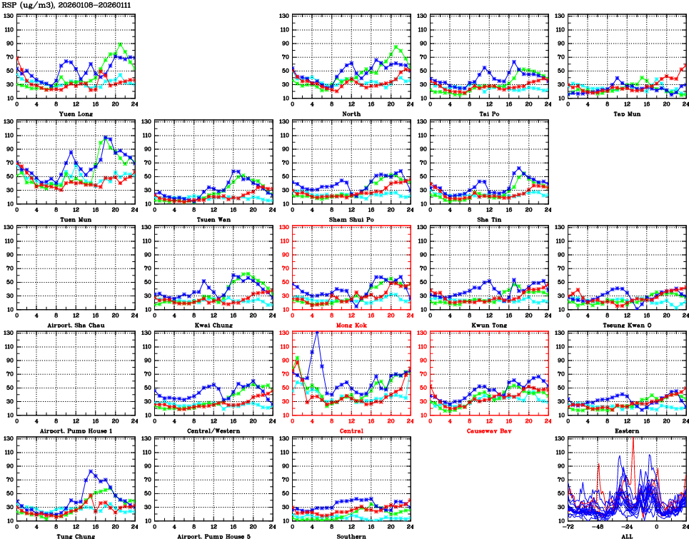 | Air Quality Data Time Series for RSP (2026/01/11) | ( Line colors: Day -3 Day -2 Day -1 Current day ) | 2D Map Current AQHI |