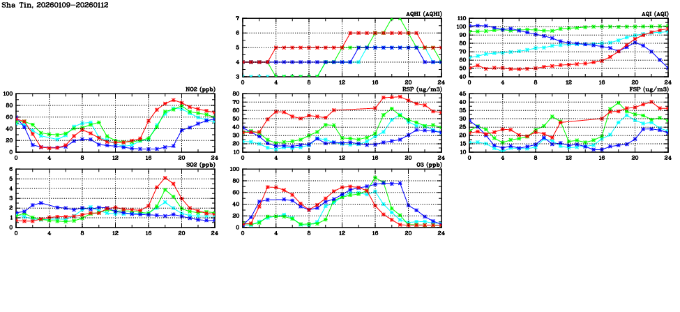 | Air Quality Data Time Series in Sha Tin (2026/01/12) | ( Line colors: Day -3 Day -2 Day -1 Current day ) | 2D Map Current AQHI |