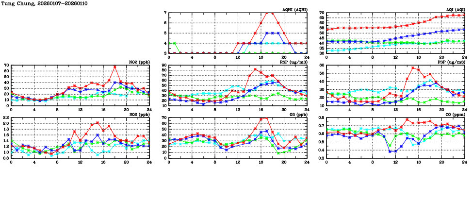 | Air Quality Data Time Series in Tung Chung (2026/01/10) | ( Line colors: Day -3 Day -2 Day -1 Current day ) | 2D Map Current AQHI |