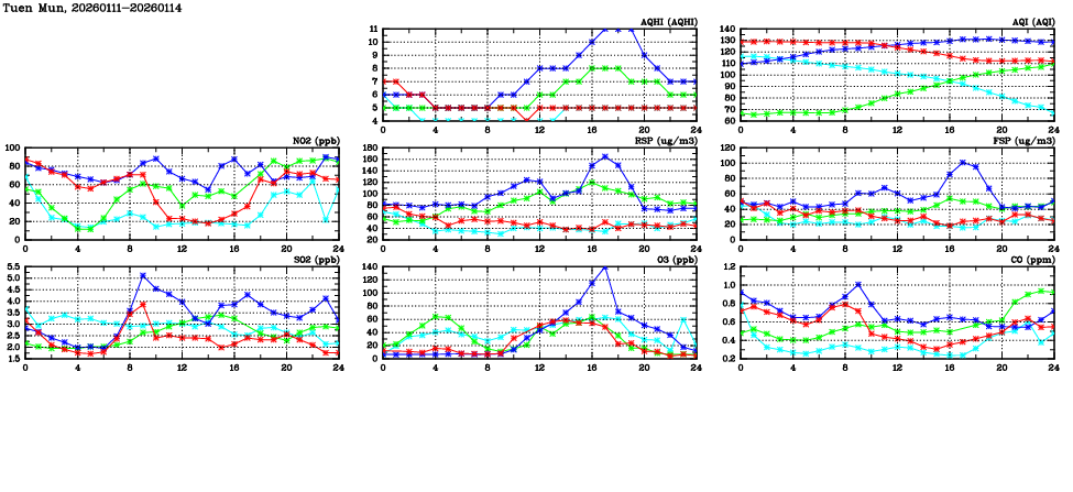 | Air Quality Data Time Series in Tuen Mun (2026/01/14) | ( Line colors: Day -3 Day -2 Day -1 Current day ) | 2D Map Current AQHI |