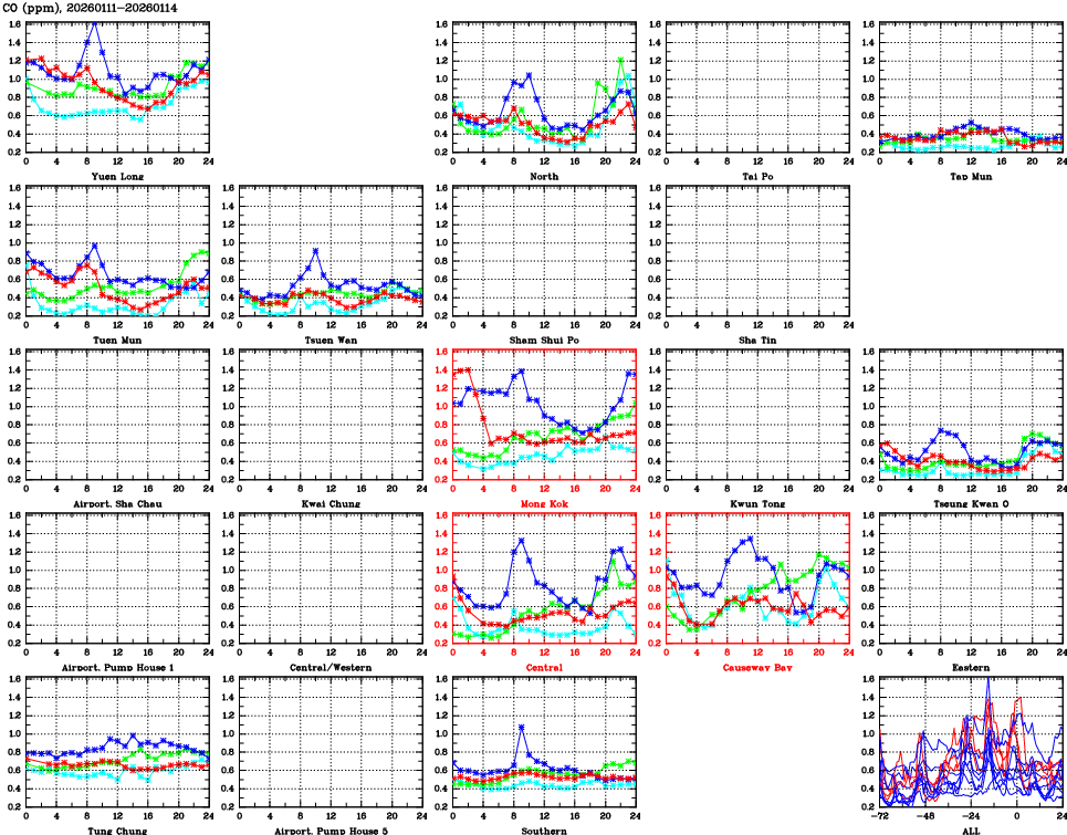 | Air Quality Data Time Series for CO (2026/01/14) | ( Line colors: Day -3 Day -2 Day -1 Current day ) | 2D Map Current AQHI |