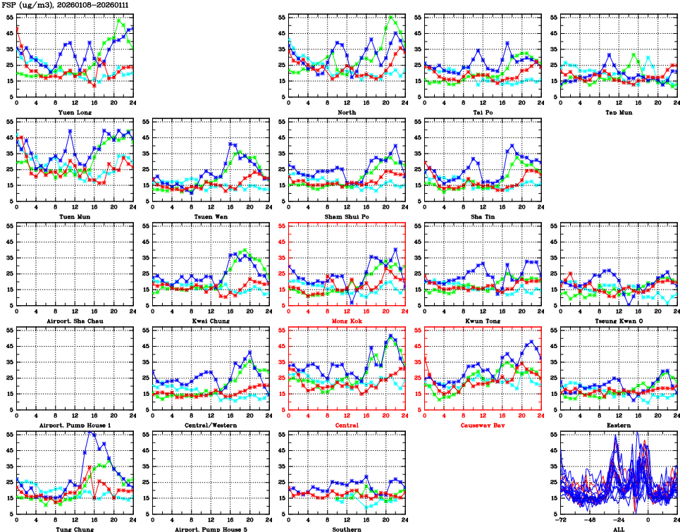 | Air Quality Data Time Series for FSP (2026/01/11) | ( Line colors: Day -3 Day -2 Day -1 Current day ) | 2D Map Current AQHI |