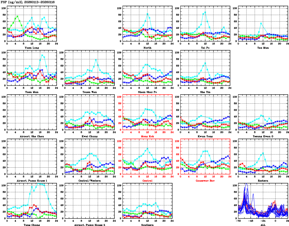 | Air Quality Data Time Series for FSP (2026/01/16) | ( Line colors: Day -3 Day -2 Day -1 Current day ) | 2D Map Current AQHI |