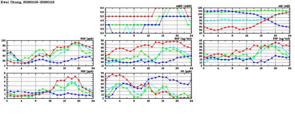 | Air Quality Data Time Series in Kwai Chung (2026/01/12) | ( Line colors: Day -3 Day -2 Day -1 Current day ) | 2D Map Current AQHI |