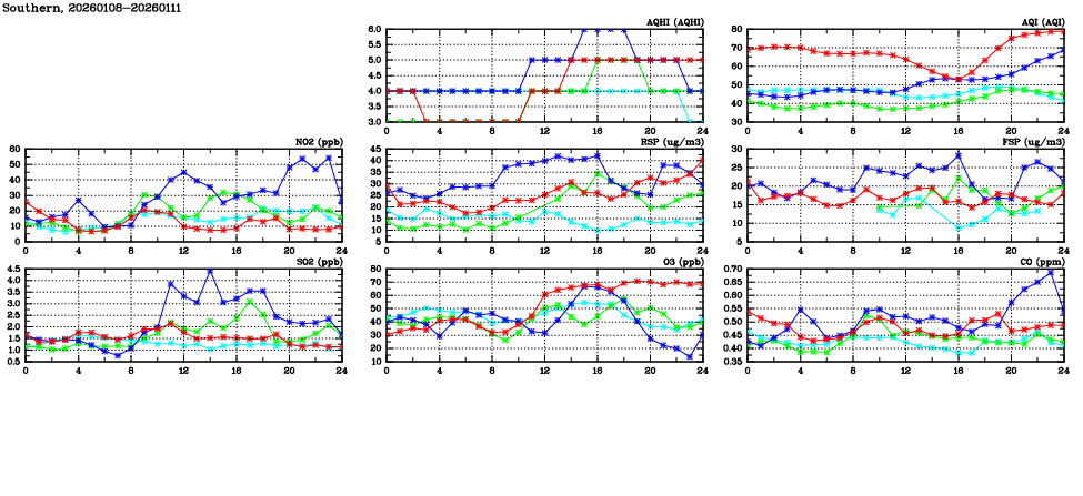 | Air Quality Data Time Series in Southern (2026/01/11) | ( Line colors: Day -3 Day -2 Day -1 Current day ) | 2D Map Current AQHI |