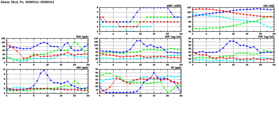 | Air Quality Data Time Series in Sham Shui Po (2026/01/14) | ( Line colors: Day -3 Day -2 Day -1 Current day ) | 2D Map Current AQHI |