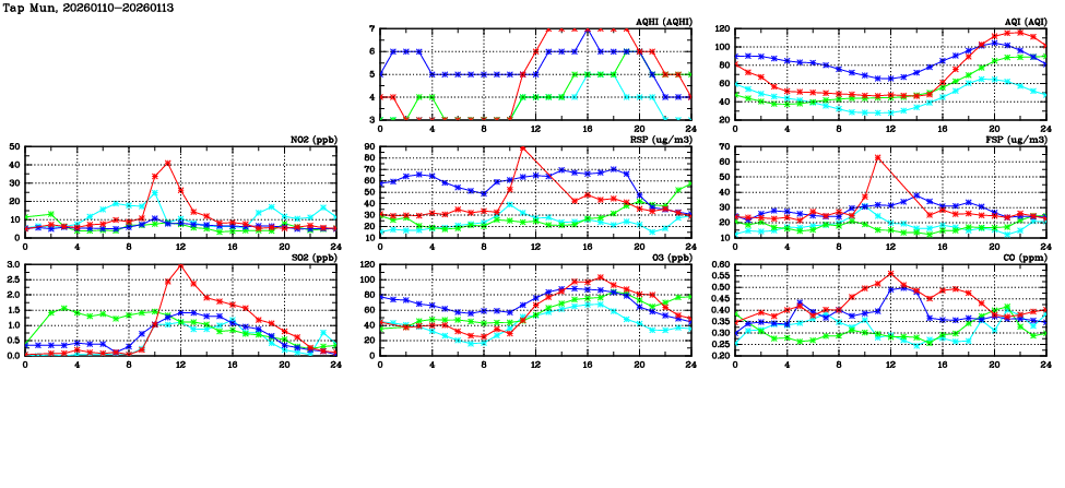 | Air Quality Data Time Series in Tap Mun (2026/01/13) | ( Line colors: Day -3 Day -2 Day -1 Current day ) | 2D Map Current AQHI |