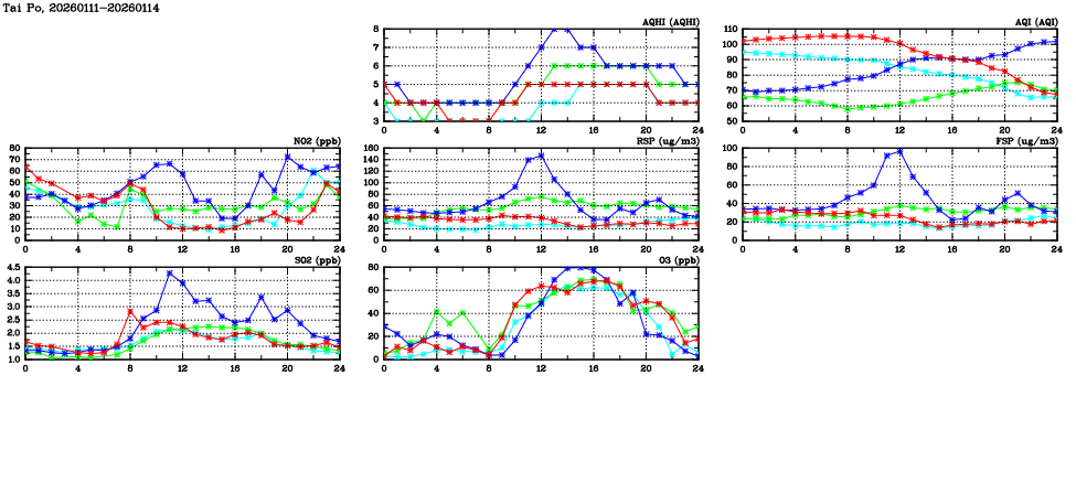 | Air Quality Data Time Series in Tai Po (2026/01/14) | ( Line colors: Day -3 Day -2 Day -1 Current day ) | 2D Map Current AQHI |