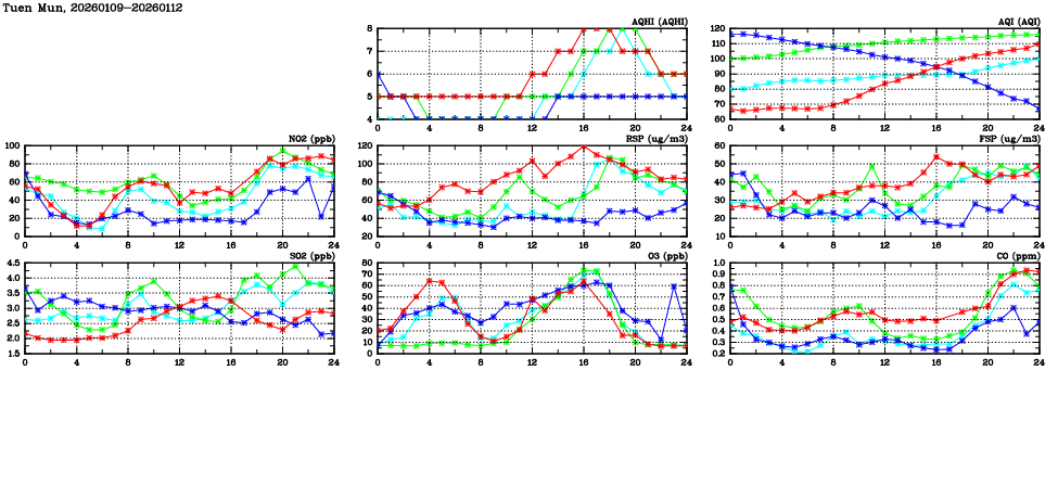 | Air Quality Data Time Series in Tuen Mun (2026/01/12) | ( Line colors: Day -3 Day -2 Day -1 Current day ) | 2D Map Current AQHI |