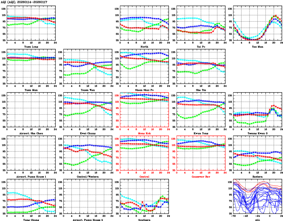 | Air Quality Data Time Series for AQI (2026/01/17) | ( Line colors: Day -3 Day -2 Day -1 Current day ) | 2D Map Current AQHI |