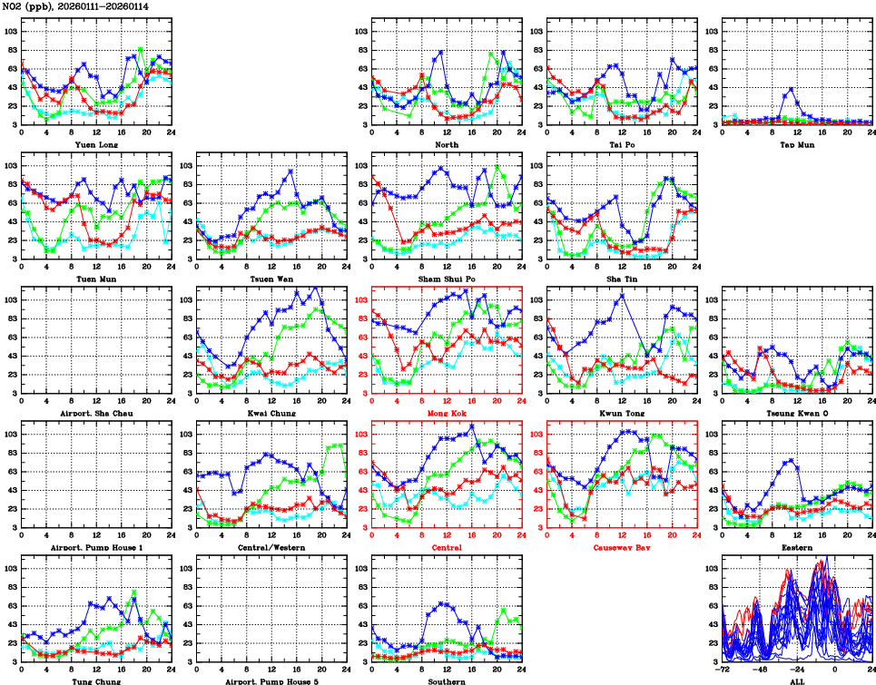| Air Quality Data Time Series for NO2 (2026/01/14) | ( Line colors: Day -3 Day -2 Day -1 Current day ) | 2D Map Current AQHI |