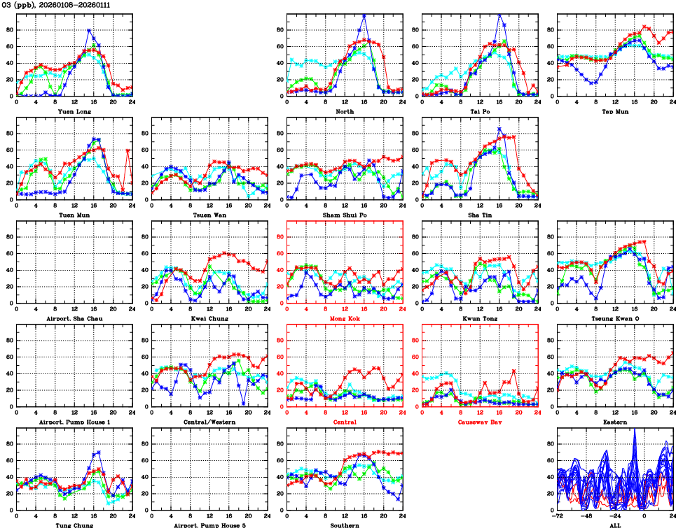 | Air Quality Data Time Series for O3 (2026/01/11) | ( Line colors: Day -3 Day -2 Day -1 Current day ) | 2D Map Current AQHI |