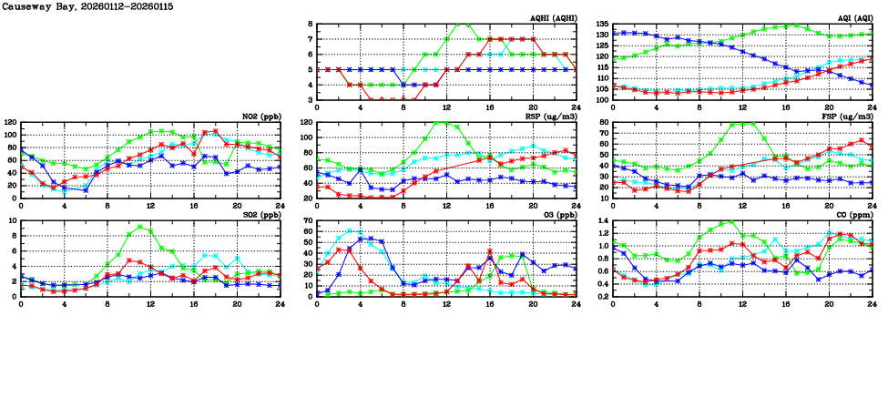 | Air Quality Data Time Series in Causeway Bay (2026/01/15) | ( Line colors: Day -3 Day -2 Day -1 Current day ) | 2D Map Current AQHI |