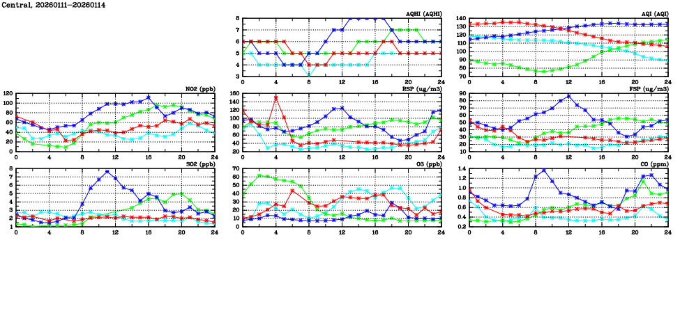 | Air Quality Data Time Series in Central (2026/01/14) | ( Line colors: Day -3 Day -2 Day -1 Current day ) | 2D Map Current AQHI |