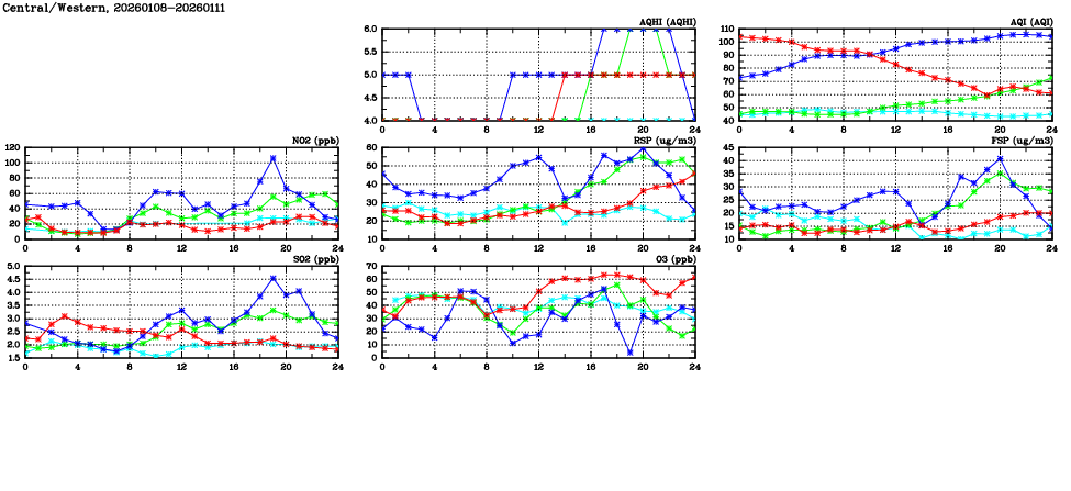 | Air Quality Data Time Series in Central/Western (2026/01/11) | ( Line colors: Day -3 Day -2 Day -1 Current day ) | 2D Map Current AQHI |