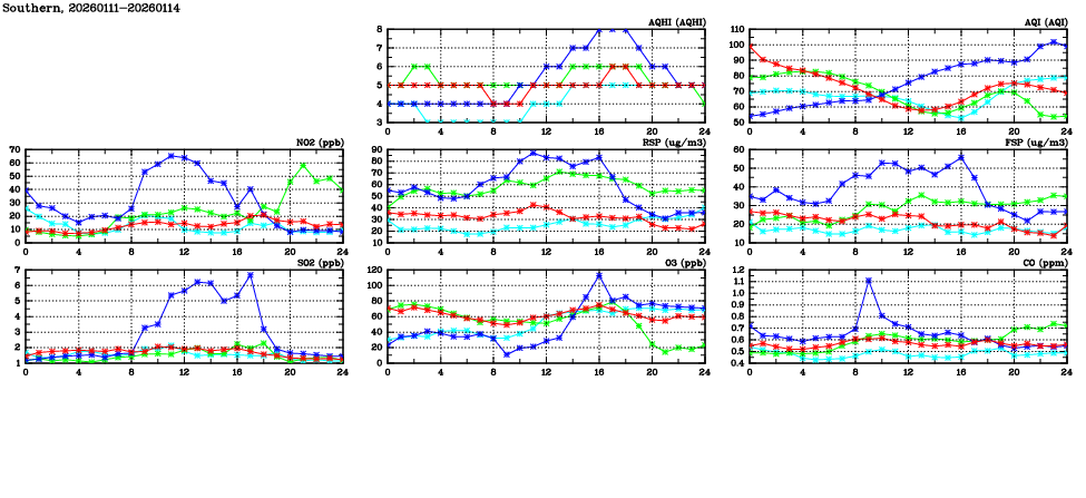| Air Quality Data Time Series in Southern (2026/01/14) | ( Line colors: Day -3 Day -2 Day -1 Current day ) | 2D Map Current AQHI |