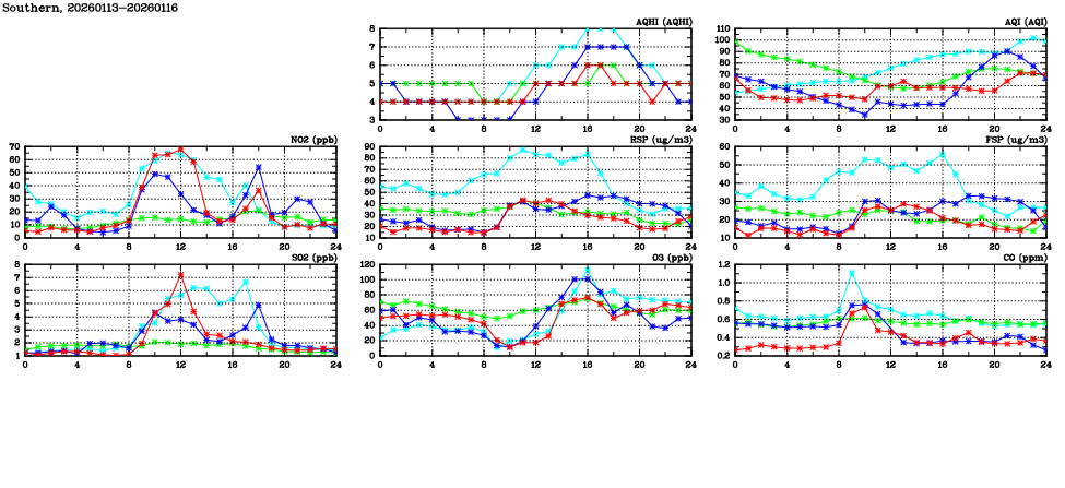 | Air Quality Data Time Series in Southern (2026/01/16) | ( Line colors: Day -3 Day -2 Day -1 Current day ) | 2D Map Current AQHI |