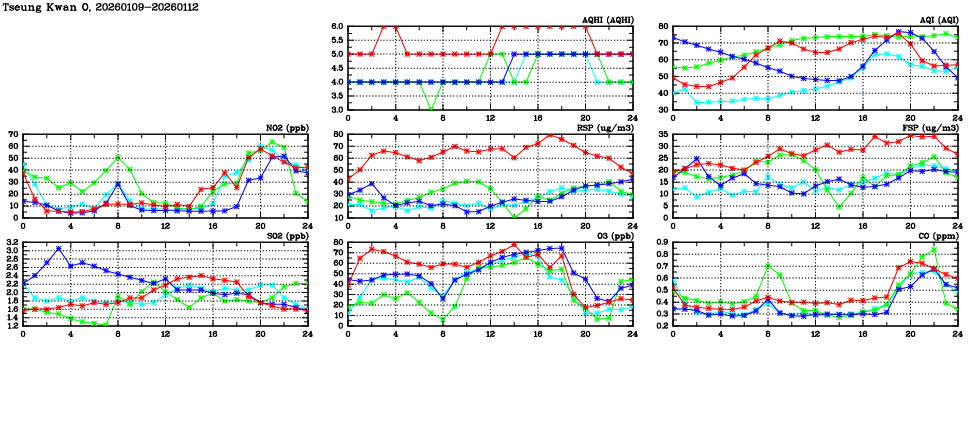 | Air Quality Data Time Series in Tseung Kwan O (2026/01/12) | ( Line colors: Day -3 Day -2 Day -1 Current day ) | 2D Map Current AQHI |