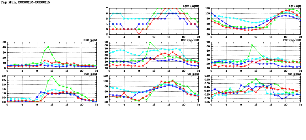 | Air Quality Data Time Series in Tap Mun (2026/01/15) | ( Line colors: Day -3 Day -2 Day -1 Current day ) | 2D Map Current AQHI |