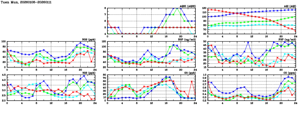 | Air Quality Data Time Series in Tuen Mun (2026/01/11) | ( Line colors: Day -3 Day -2 Day -1 Current day ) | 2D Map Current AQHI |