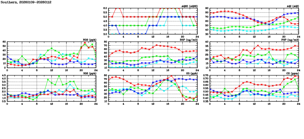 | Air Quality Data Time Series in Southern (2026/01/12) | ( Line colors: Day -3 Day -2 Day -1 Current day ) | 2D Map Current AQHI |