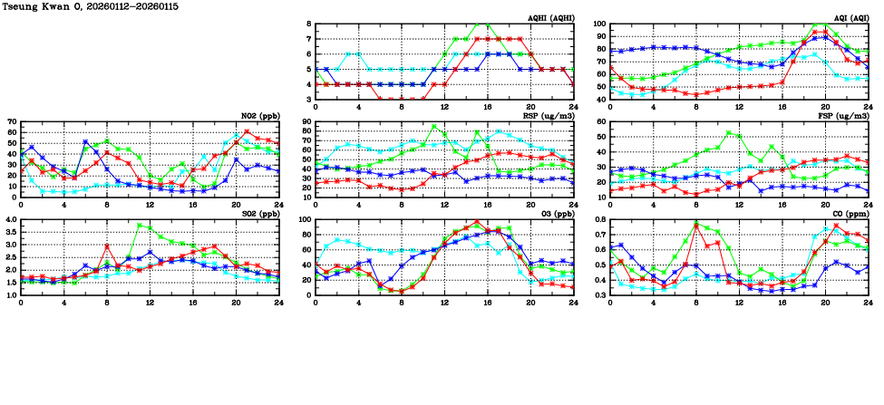 | Air Quality Data Time Series in Tseung Kwan O (2026/01/15) | ( Line colors: Day -3 Day -2 Day -1 Current day ) | 2D Map Current AQHI |