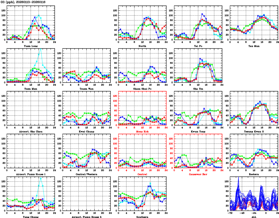 | Air Quality Data Time Series for O3 (2026/01/16) | ( Line colors: Day -3 Day -2 Day -1 Current day ) | 2D Map Current AQHI |