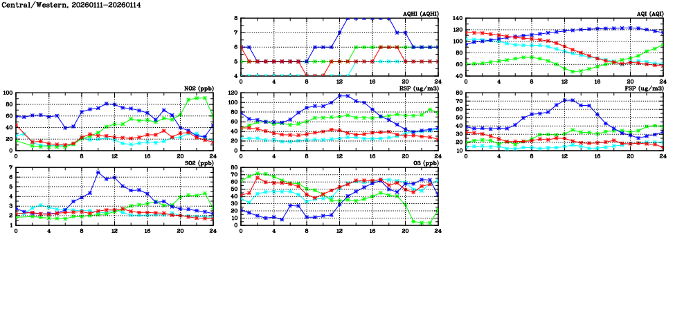 | Air Quality Data Time Series in Central/Western (2026/01/14) | ( Line colors: Day -3 Day -2 Day -1 Current day ) | 2D Map Current AQHI |
