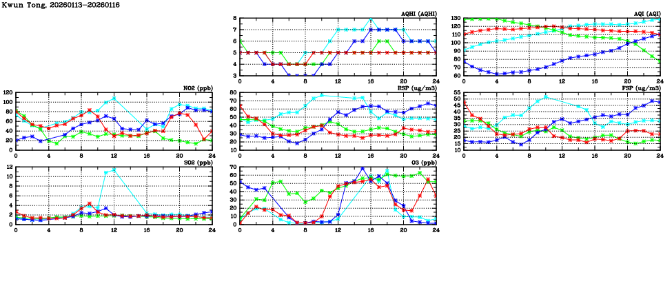 | Air Quality Data Time Series in Kwun Tong (2026/01/16) | ( Line colors: Day -3 Day -2 Day -1 Current day ) | 2D Map Current AQHI |